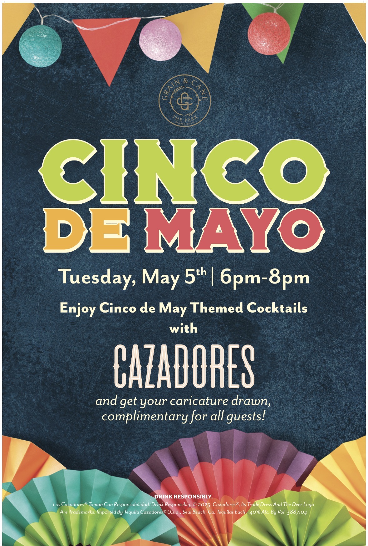 Join us for an exciting evening of Cinco de Mayo celebrations at Grain & Cane! Enjoy fun, festive cocktails with Cazadores and get your caricature drawn, complimentary for all guests!
